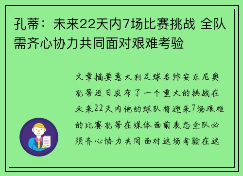 文章摘要:本文将对比利时足球名宿、英格兰足球顶级联赛伯恩利队主教练孔帕尼近期对裁判争议的回应进行详细探讨。孔帕尼在面对裁判判罚争议时,以自己曾带领球队降级的经历为背景,强调了对公平执法的尊重,并且表达了自己对于裁判判罚不应过度反应的观点。文章将从四个方面展开分析,分别是孔帕尼的职业背景及其对裁判公正性的看法、他对于裁判判罚争议的理性回应、降级经验如何塑造他对于比赛公平的理解、以及作为主教练的角色中...